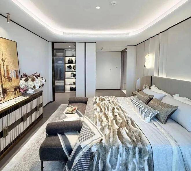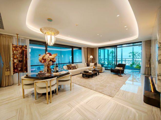 以建面约228㎡的4房户型为例,其独立电梯厅面积约7.5㎡,可作为入户前的收纳空间。约270°环幕大边厅,将室外的城市美景尽收眼底。客餐厅与阳台面积近53㎡,尺度阔绰,适合举办各类社交活动。主卧大套房设计,面积约50㎡,配备超大主卫和独立衣帽空间,彰显顶豪水准。