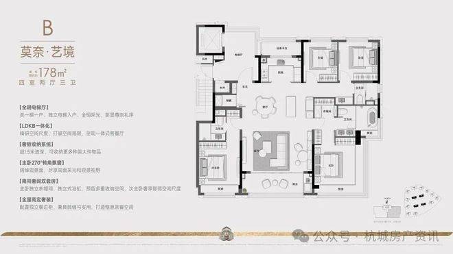 270°全明电梯厅、奢阔大四房南向双套房、中西结合两大餐饮中心、270°无边界艺术主卧、270°观景飘窗奢装艺术主卫、全屋精细化收纳,挚献杭州塔尖奢赏