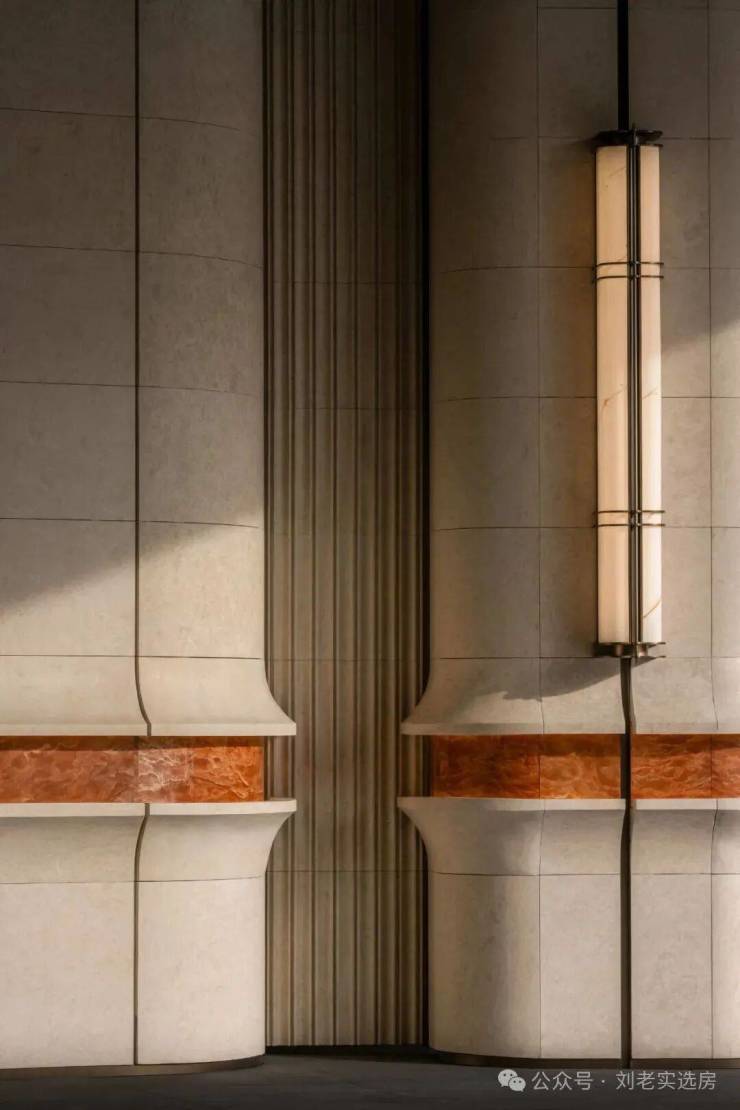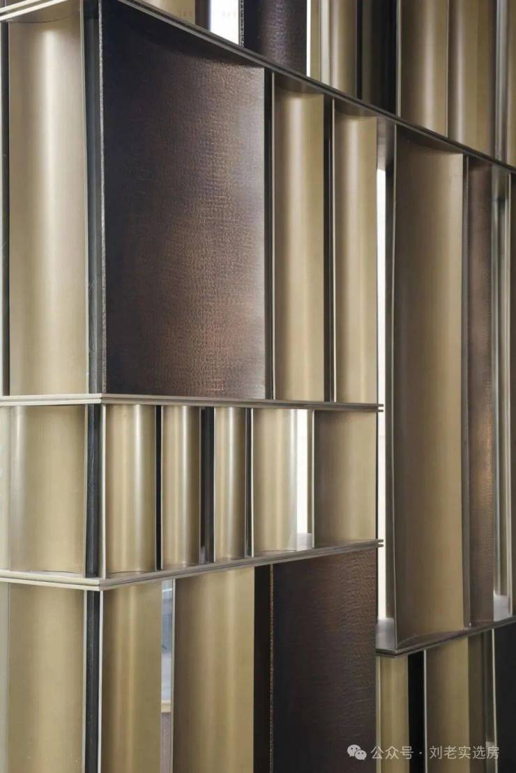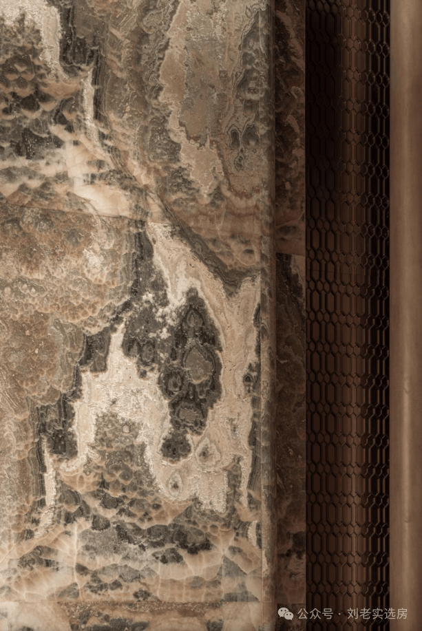 顶部定制发光云石亚克力与圆弧形的古铜色铝板交相辉映,8个西班牙宫殿沉香米黄石柱提升了尊崇感,漫步其间,揽风入怀,树影斑驳映入眼帘,水声潺潺入耳,归家的轻松感油然而生,笔者随手一拍,都非常的出圈。