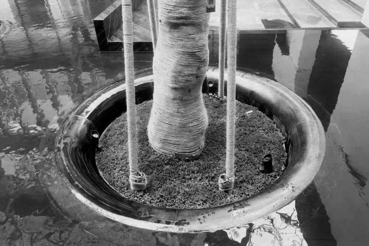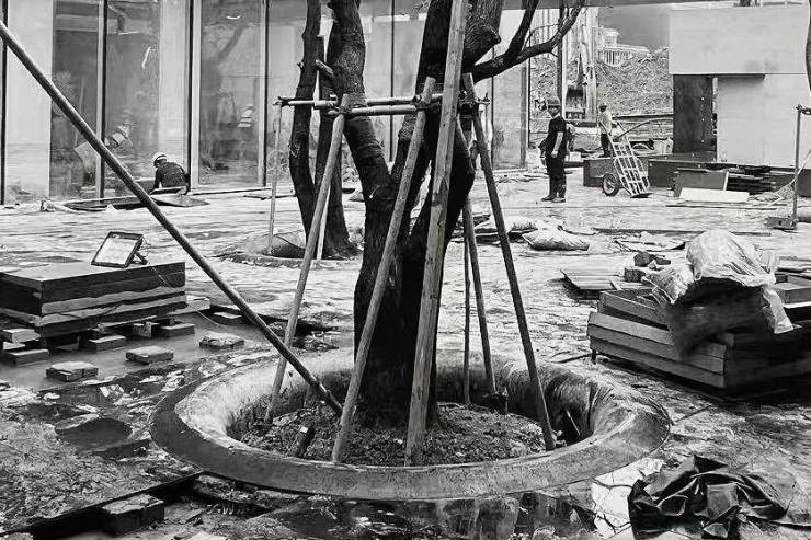 中庭水景区域规划 7 个椭圆黑金沙树池,七颗乌桕沿庭院动线分布,象征“七星追月”,让庭院每一处景致都承载着文化温度与生活向往。为保障造型精度与安装效果,所有树池均采用后场异形定制加工。先依据设计尺寸在后场完成个性化裁切、打磨等精细加工工序,同步进行预拼装与位置预摆核验,确保造型弧度、拼接缝隙及整体布局完全契合设计要求后,再统一转运至现场,按预摆确定的点位进行精准拼装安装,实现从加工到落地的高效衔接与品质把控。