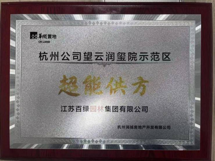 精工细作,铸就精品。百绿园林严格执行甲方标准,不断攻克工艺难点,凭借高质量精细化施工与高效团队管理,实现项目完美落地,荣获华润置地杭州公司示范区“超能供方”荣誉,驻场项目经理、施工团队成员分别斩获“优秀项目经理”、“优秀个人”荣誉。