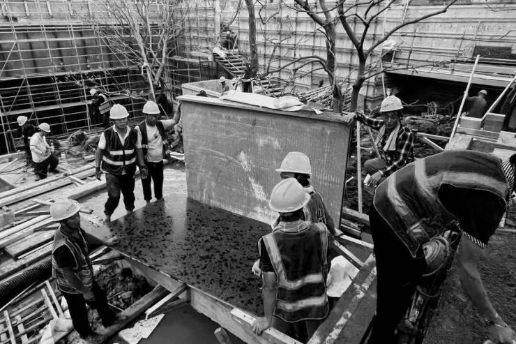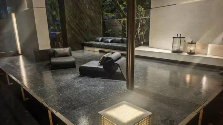 悬崖会客厅廊架地面采用安哥拉黑 3.6m×1.8 m×0.3m 大板铺贴,施工难度极大,需 8 人协作抬运并配合机械作业,最终呈现出大板面的优质效果。