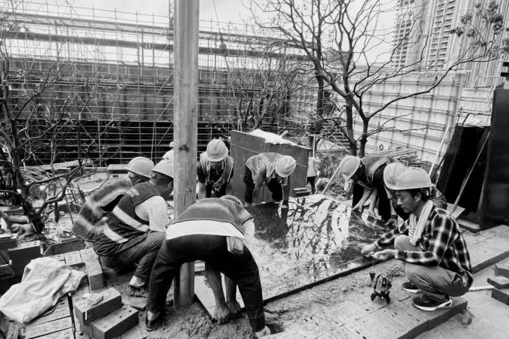 The floor of the cliff reception room pergola was paved with large boards of 3.6m× 1.8m ×0.3m from Ango Shielding. The construction was extremely difficult and required the collaboration of 8 people to lift and transport them, along with mechanical operations. Eventually, the high-quality effect of the large board surface was presented.
