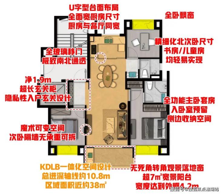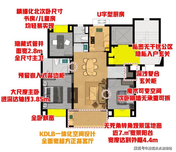 大横厅设计,南向面宽达到约7米,IMAX巨幕级采光面。U型厨房,餐厅与客厅一体化设计,客厅还带飘窗,家庭活动空间达到了40 m²,非常阔绰。