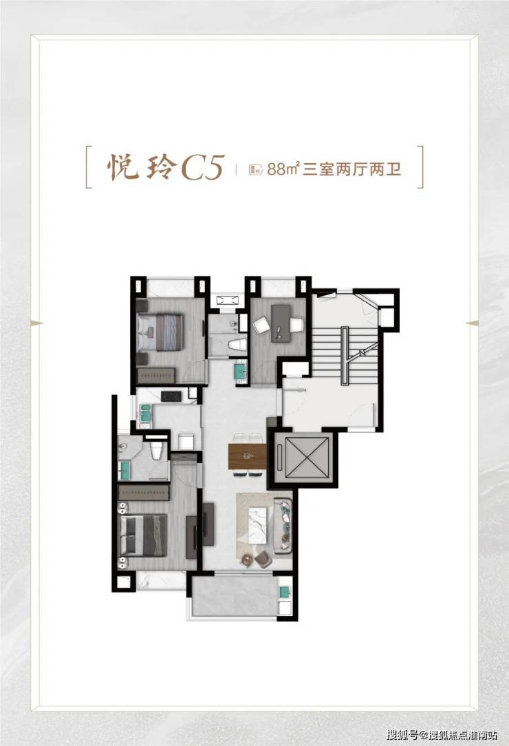 户型为建面约88-100㎡,全部都是3房2厅2卫设计,户型在尺寸和布局上略有差异,同样优秀。洋房完整户型图如下: