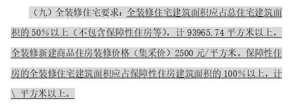 全装修住宅要求:全装修住宅建筑面积应占总住宅建筑面积的50%以上(不包含保障性住房等),计93965.74平方米以上,全装修新建商品住房装修价格(集采价)2500元/平方米。保障性住房的全装修住宅建筑面积应占保障性住房建筑面积的100%以上,计\ 平方米以上。