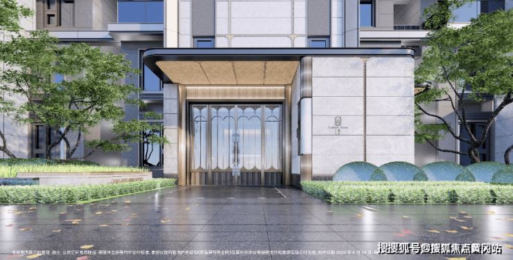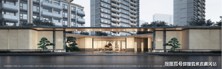 酒店式门廊作为归家的第一道风景招商臻境预约热线 :400-885-2009 ✔✔✔以空间大尺度与高级奢石的材质使用将尊崇的归家礼遇感拉满。近50米宽,高度约5.3米高,开口约11米长的高规格酒店式大门。选用了贝金米黄石材作为墙面主材,墙裙用印度蓝石材做装饰。两侧甄选了两颗名贵的罗汉松,有着恭迎归家的美好寓意。