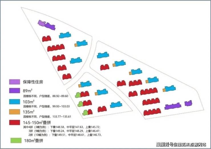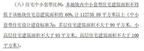 根据出让合同要求,项目住宅套数下限1565套,中小套型住宅建筑面积不得低于该地块住宅总建筑面积的 60%,中小套型住宅设计建设标准为:多层住宅建筑面积不大于90平方米、小高层住宅建筑面积不大于95平方米、高层住宅建筑面积不大于100平方米。