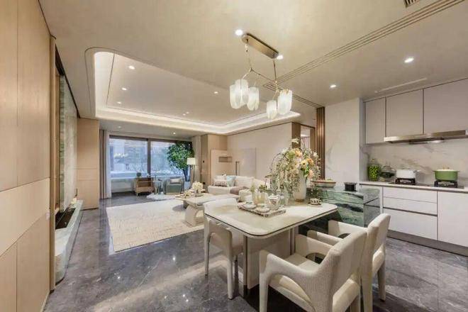 厨房+餐厅+客厅+阳台在一条动线上,显著拉升空间感,也增加了生活中的互动交流;