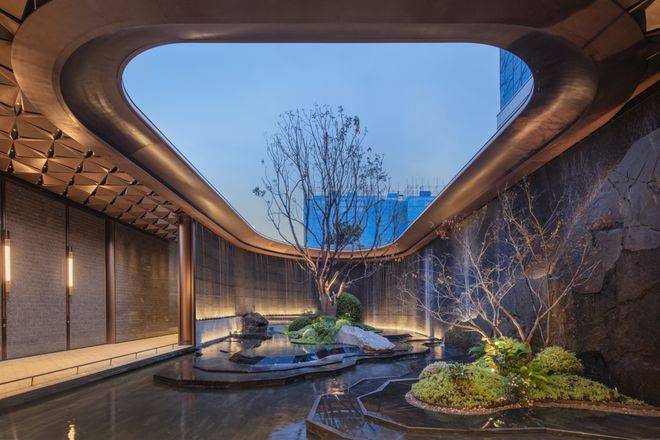 在这里,长约23米的恒温泳池一眼望尽,没有一根立柱遮挡视线,玻璃幕墙与下沉庭院相映成趣,生活的质感油然而生;