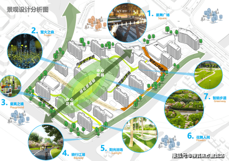 为了营造“森林家园”的居住理念,整个社区通过多维空间、全景化、人性化的居住氛围,设置了星舞广场、萤火之森、童真之境、骑行江湖、阳光浴场、花舞人间以及智能步道7大主体景观。