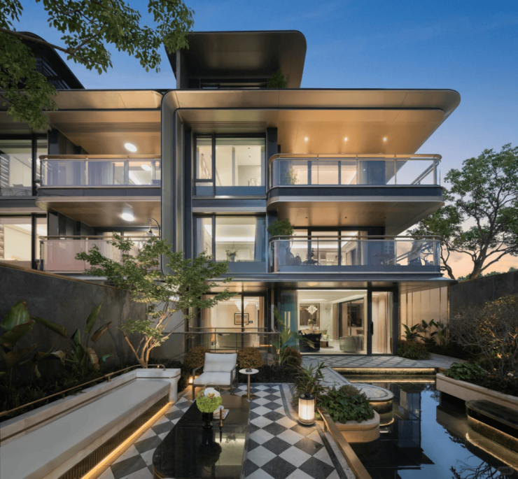 望云庭的立面,采用了豪宅御用的四面铝板,整体造型以钱塘江自然曲线为设计母题,外立面通过香槟金和深灰双色铝板幕墙,配以铂金钻、黑金沙等石材与玻璃弧角工艺,构建出富有张力的几何美学界面。