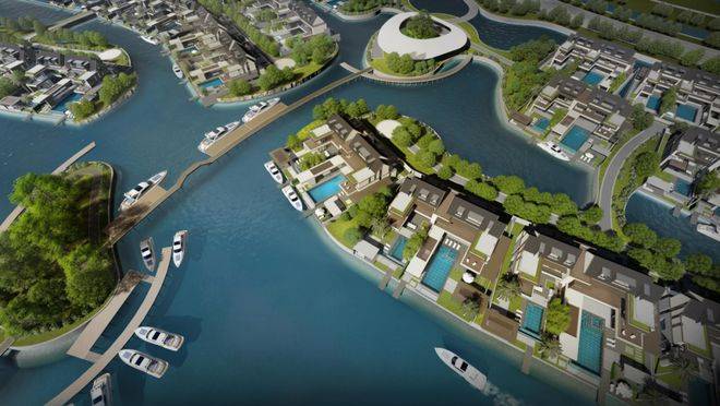 项目从此前曝光的设计方案就可以看出亮点,每一排别墅前都有一条渠道,引入水系,可以停游艇。