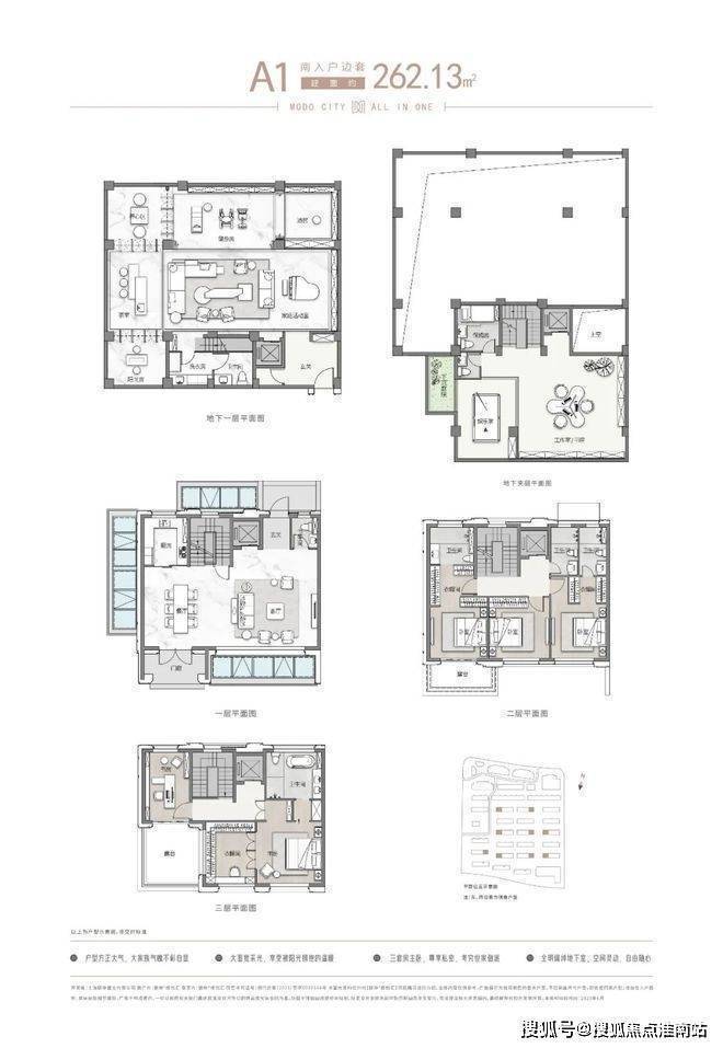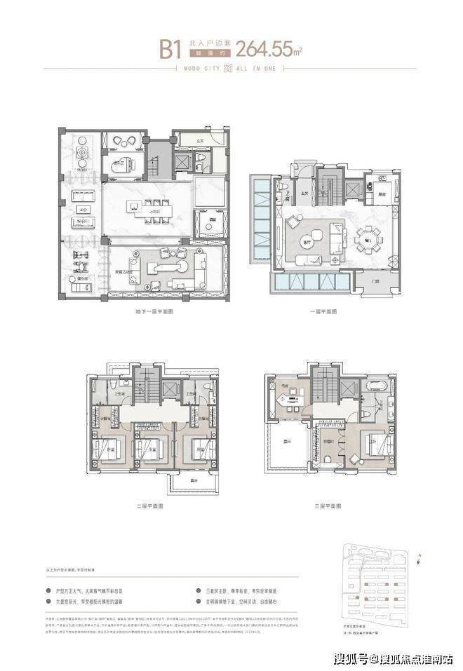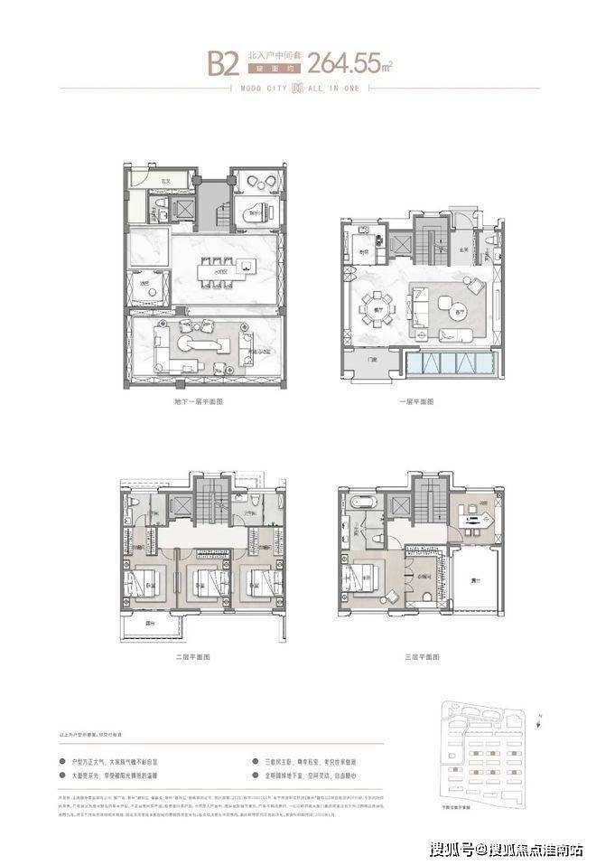项目主推建面约262-305㎡联排别墅,分为南北入户,均为地上三层,地下两层设计,满足业主们“有天有地有花园”的别墅居住体验!