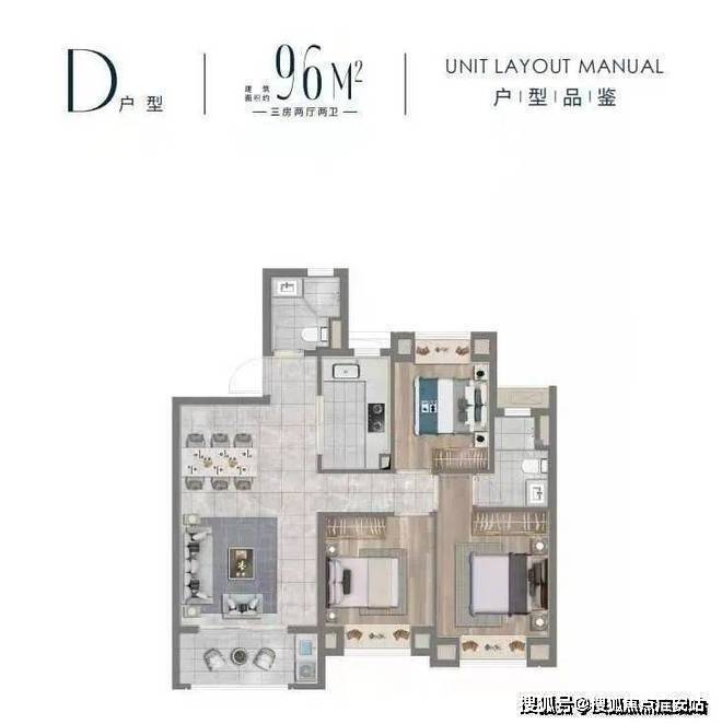 D户型建面约96㎡三房两厅两卫▼