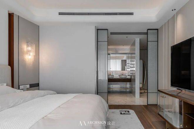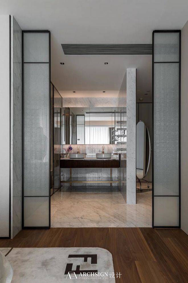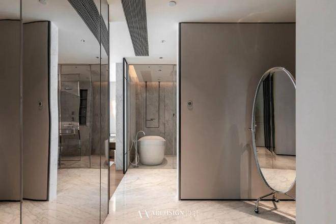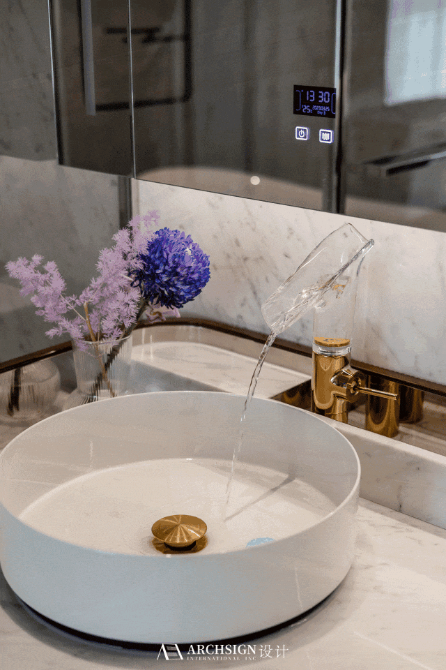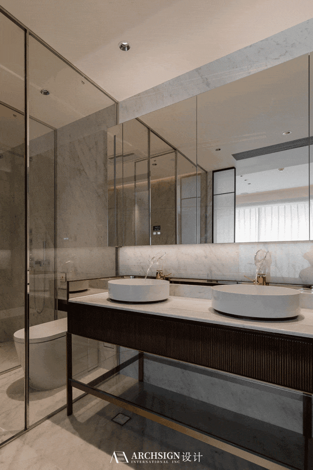 杭 州 壹 号 院主卫以优雅的白色大理石铺装而成,纵向延申的浴缸可以俯瞰整个奥体板块以及钱江新城。