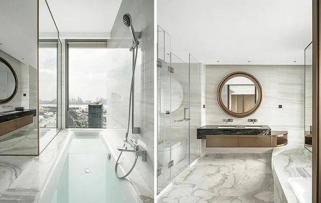 The master bathroom of Hangzhou Yihao Hospital is paved with elegant white marble. The vertically extended bathtub offers a panoramic view of the Olympic Sports Area and Qianjiang New Town.