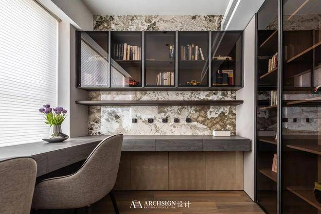 The Nobilia integrated kitchen in Germany features painted door panels that are custom-made for the One Yard residential complex in Hangzhou. The combination of the imitation granite color and dark wood grain enhances the overall look, and is complemented by the dark glass cabinets from Nobilia.