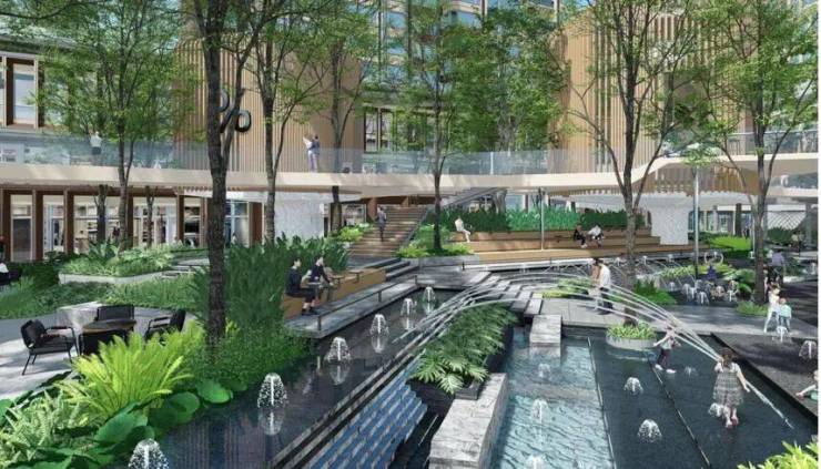 值得一提,商业景观有三大主场景, 分别为森感公园、九曲花街、花园大道。其中森感公园里约40%都是超过十米的大树,绿意盎然。