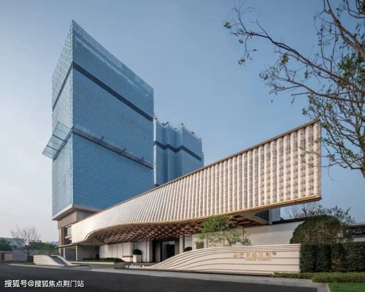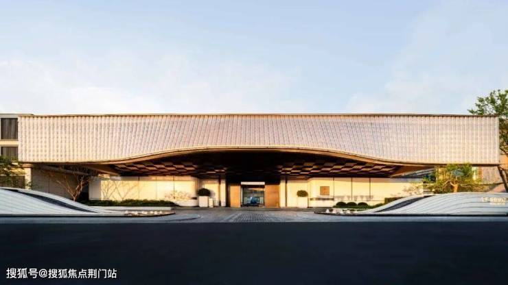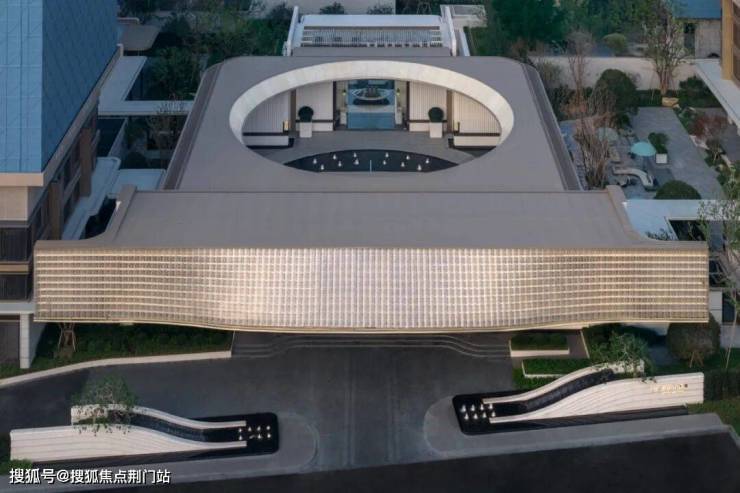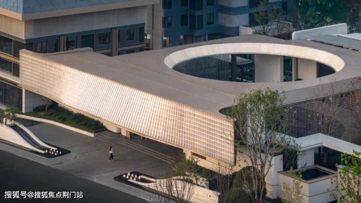 首先,楼盘的主入口是宽约46米、高约9米的阔绰大门,顶部是由约2280片波浪形的水晶玻璃瓦拼合而成的大屋檐,灵感来自“京杭大运河博物馆”。