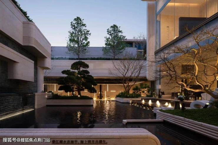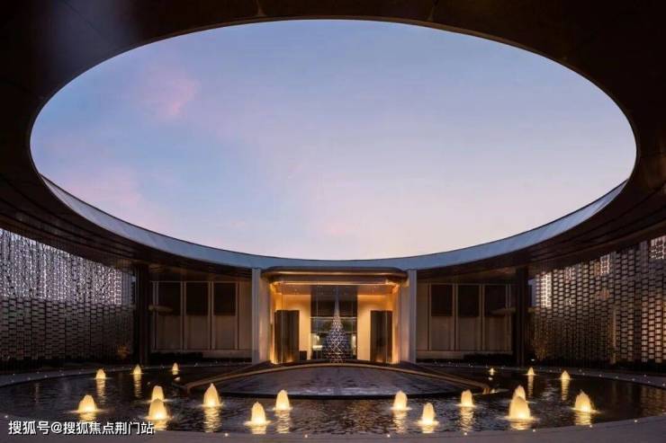 从主入口迈入第二重景观,可以看到一大片圆形水景。是直径约30米,总面积约660㎡的空间,以“天圆地方”为设计理念,池底铺满幻影蓝石材,中间点缀一个“水滴”造型雕塑,将水引入大区景观中,打造“四水归堂”的礼序空间。