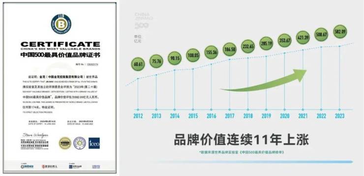 自2005年以来,金茂已经连续19年入围“中国500最具价值品牌”榜,2023年更是以582.09亿元的品牌价值位列第174名。(数据来源于金茂官网)