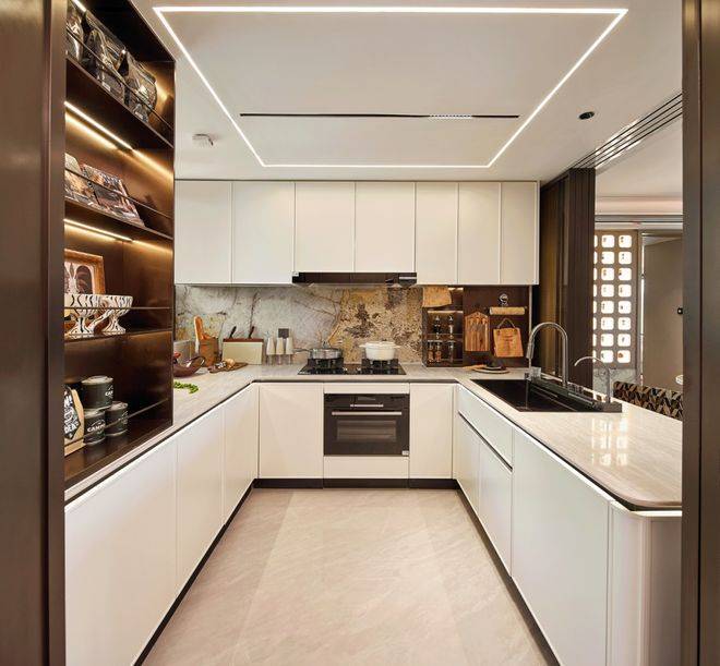 b.U 型厨房更创新采用上海首个高低台设计,既解决下厨弯腰痛点,三面台均分还能拓展操作空间。
