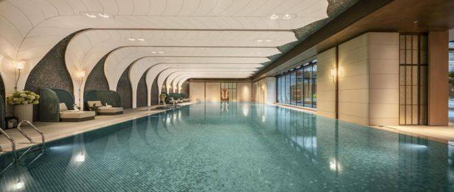 恒温泳池:第一,采用了景德镇烧制的陶瓷马赛克,独特的釉面色彩由景德镇老师傅手工浇筑而成,充满人文艺术底蕴;第二,羽毛天花造型,由600余件铝板打造,表面采用了仿贝壳纹的艺术漆处理,带来松弛度假感;第三,不仅配置了约25m×10m的4道泳池,还采用了奥运会同款空调除湿系统,彰显高档品质细节!
