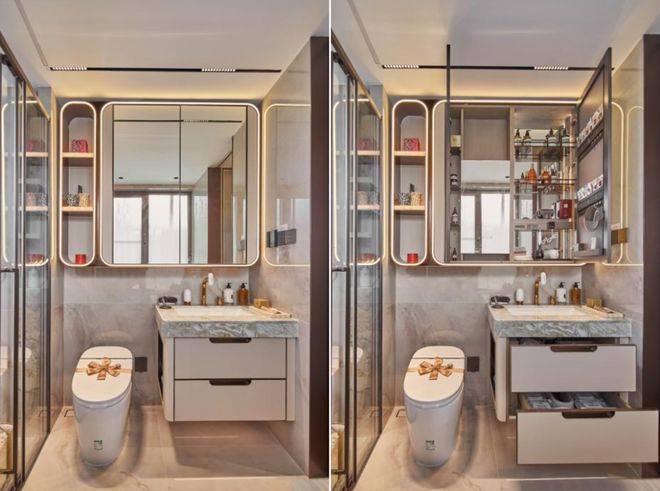 保利天奕特别关注到女性的生活需求,专门在卫生间配备了科勒美颜龙头、美妆镜柜、美妆冰箱,采用“顶+面双补光照明”,能把“女本位”需求做到如此细致,目前没有几个项目能做到!