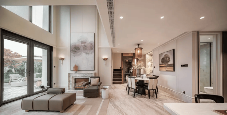 建面约132m²联排艺墅,巧设前庭后院+超大挑空+南北双星空露台+室内庭院等超享空间的配置,首层会客空间,南朝超6m面宽,以全景落地窗为画框,将庭院绿意引入厅堂;约5.4m层高的地下室更可根据私家喜好百变随心;南北双星空露台设计,搭配270°的广角河景,也极大地丰富了联排的瞰景视界。