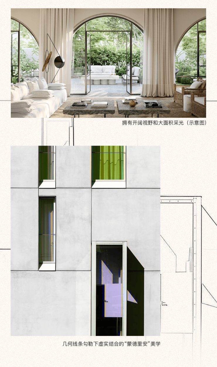 「开阔尺度」:约3.6米层高、超大窗墙比等花园里弄的尺度突破,尽显居者风度。