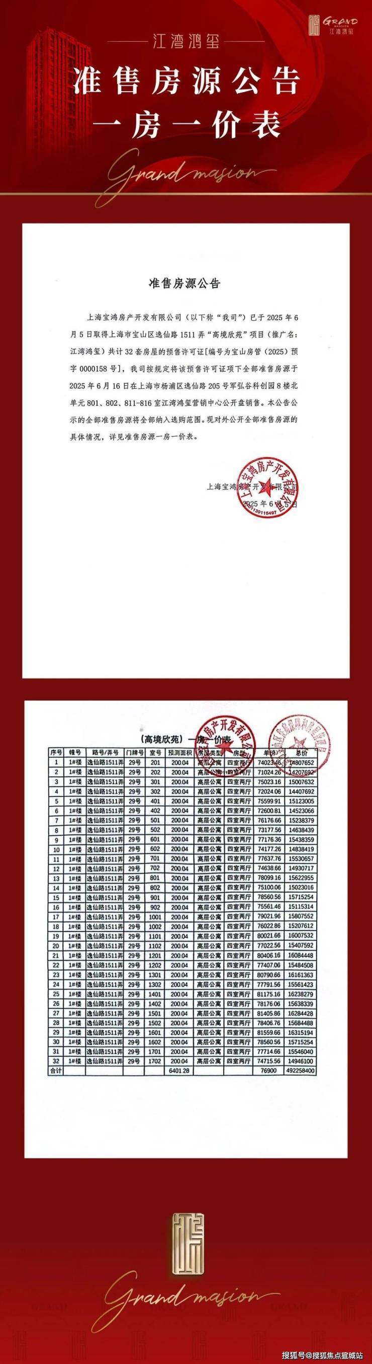最新消息,宝山高境「江湾鸿玺」在售中!推出建面200㎡大平层,总价约1420万起!