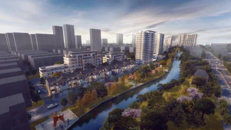 而项目整体建筑布局随河蜿蜒,高低错落的建筑形态也契合了江南水乡的水韵特色。