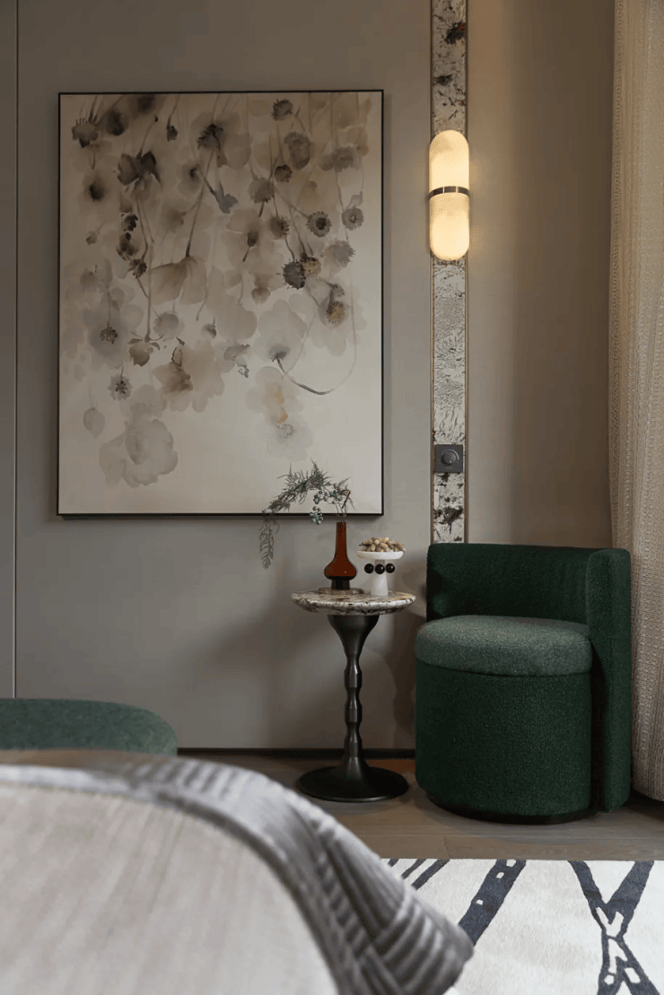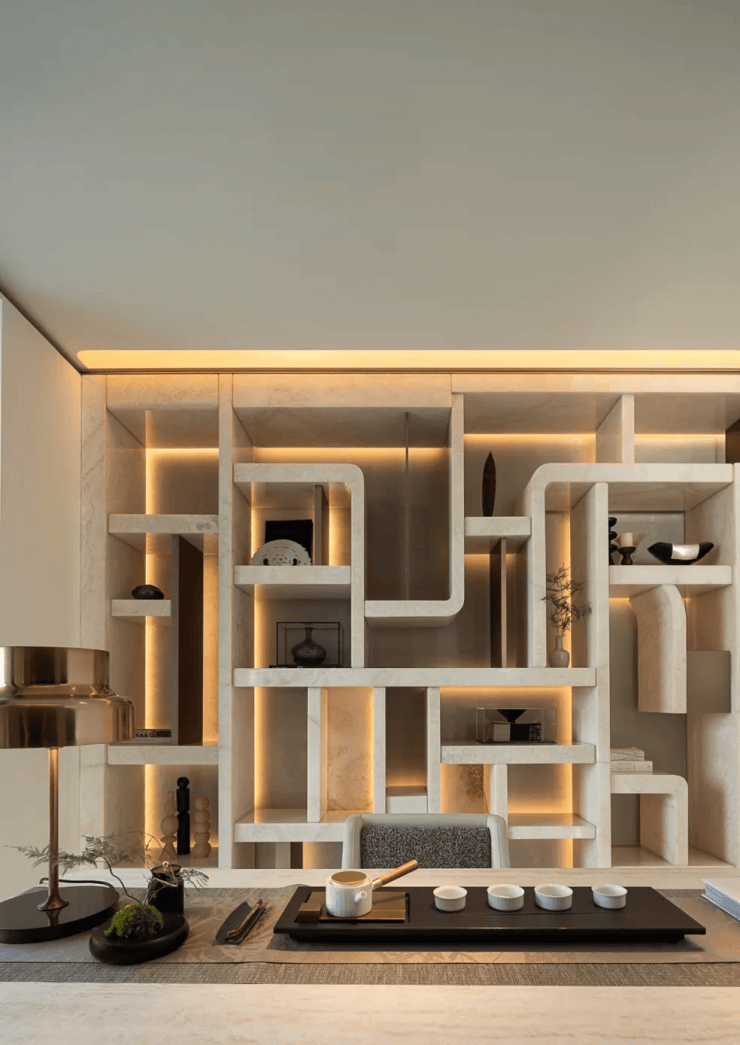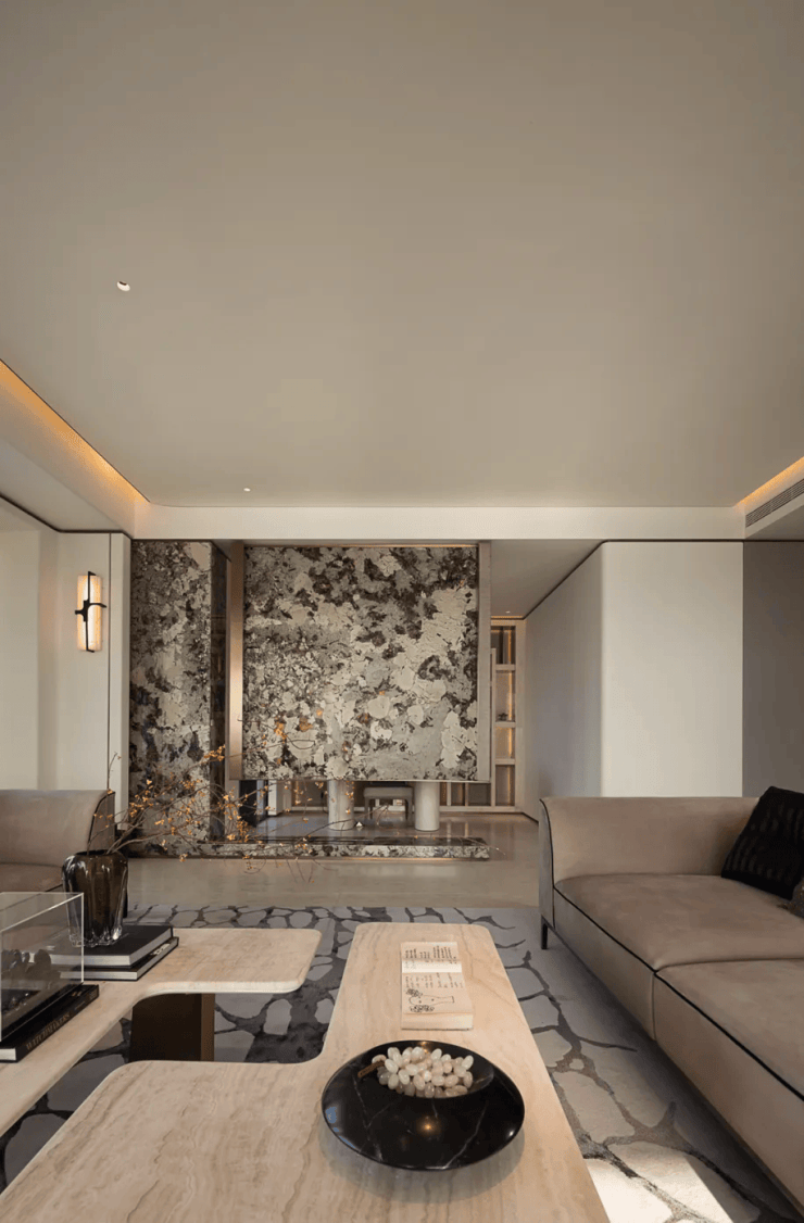 蓝灰色玻璃+仿石铝板+艺术涂料材质,穿插优雅线条,让建筑这张“脸”看起来更高级。One&Only酒店式门头。用雕塑体块、温润弧面和雅致线条,营造具有艺术格调的归家仪式感。