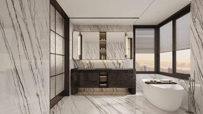 主卧套房以“小家化”理念进行规划,形成一个集睡眠区、独立衣帽间、私属卫浴于一体的完整、私密的休憩系统。步入其中,仪式感与舒适感并存。双台盆设计的豪华主卫,让晨起洗漱告别等待,成为并行不悖的从容时光;临窗设置的独立浴缸,则是在家中为自己预留的一片放松天地。结束一天的忙碌,泡一个热水澡,看窗外繁星或灯火,疲惫随之消散,这是献给专属自我的犒赏。