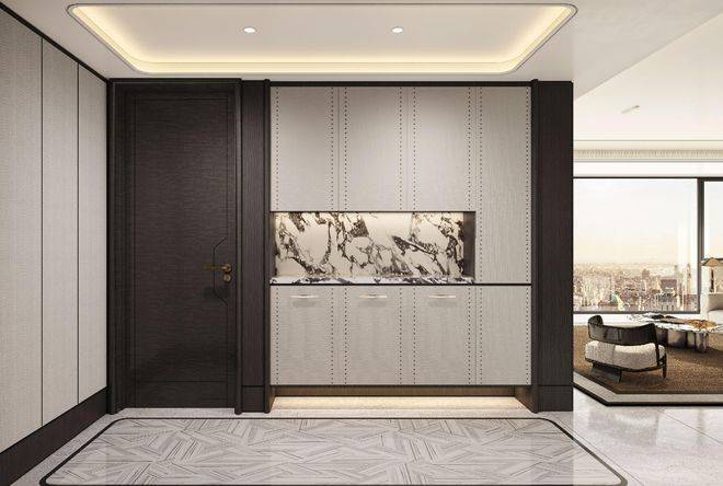 玄关、客餐厅、厨房及过道地面全线升级为天然石材,其中玄关区域更以玉石铺陈,踏入门的第一刻,便感受到扑面而来的艺术气息与尊贵气质。玄关柜的板材升级为皮革面板,触感温润细腻,视觉上简约高级,每一次开合都成为一次愉悦的感官体验。