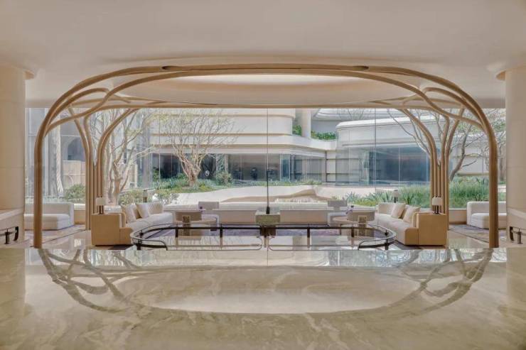 大门内外两重门厅景墙运用月光米黄石材近1000 方,搭配香槟金金属线条,汲取爱马仕全球旗舰店的双曲面叠墙造景手法,增加景墙奢华质感。 项目沿河的楼幢整体上抬,也就是——抬地式。好处在于地库通风,客户行车归家动线更合理。