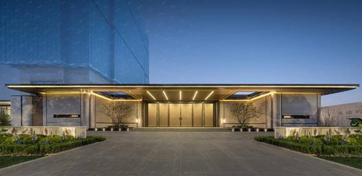 立面方面,汲取现代轻奢法式的白金美学灵感,叠加大面玻璃,打造出光影灵动的对称式金色画框立面。