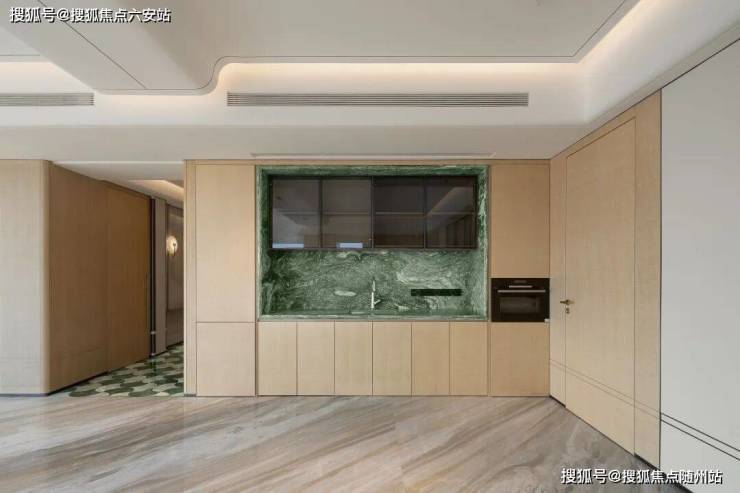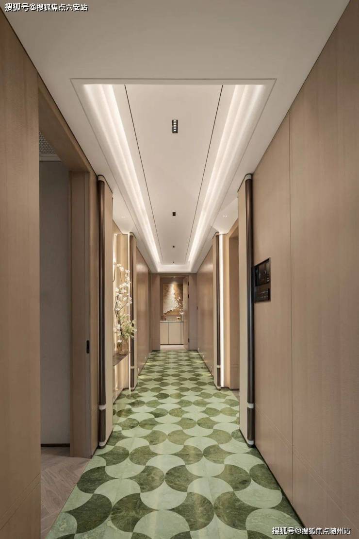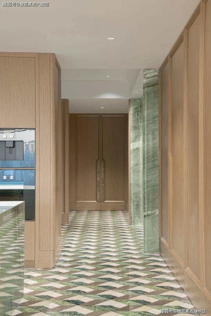 细节处,奢石与影木交相辉映,以水刀拼花工艺铺就艺术长廊,从电梯厅延伸至室内;大师美学灵感的奢雅渗透生活每一处肌理。