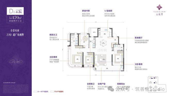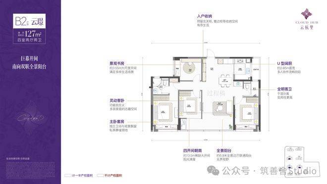 大量赠送面积的拓展,使其拥有约97.44%的超高得房率,堪比市场面主流约150㎡+户型的实用空间。