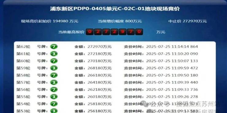 7月25日,在上海六批次土拍中,浦东新区PDP0 - 0405单元C - 02C - 01地块吸引了7家房企参与竞拍。经过62轮激烈竞价,该地块以40%的溢价率封顶,并进入竞高品质环节。