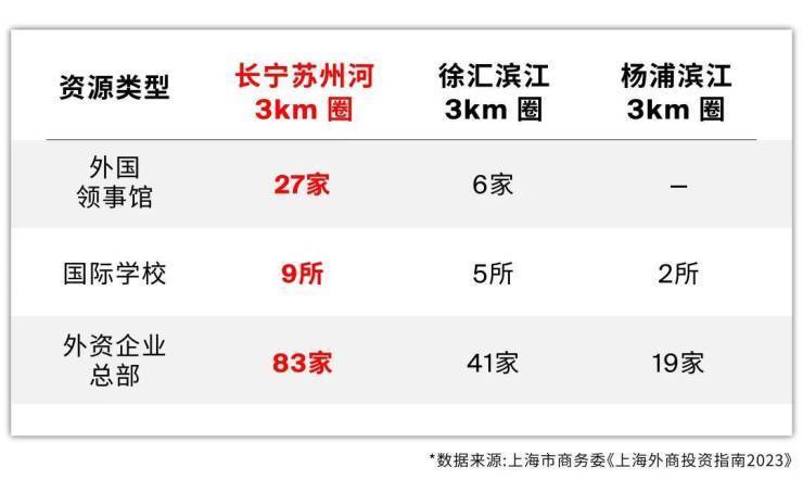 据上海市商务委《上海外商投资指南2023》数据显示,长宁涉外资源密度是徐汇滨江的2-3倍、杨浦滨江的4-10倍,是能够支撑国际客群支付溢价的!