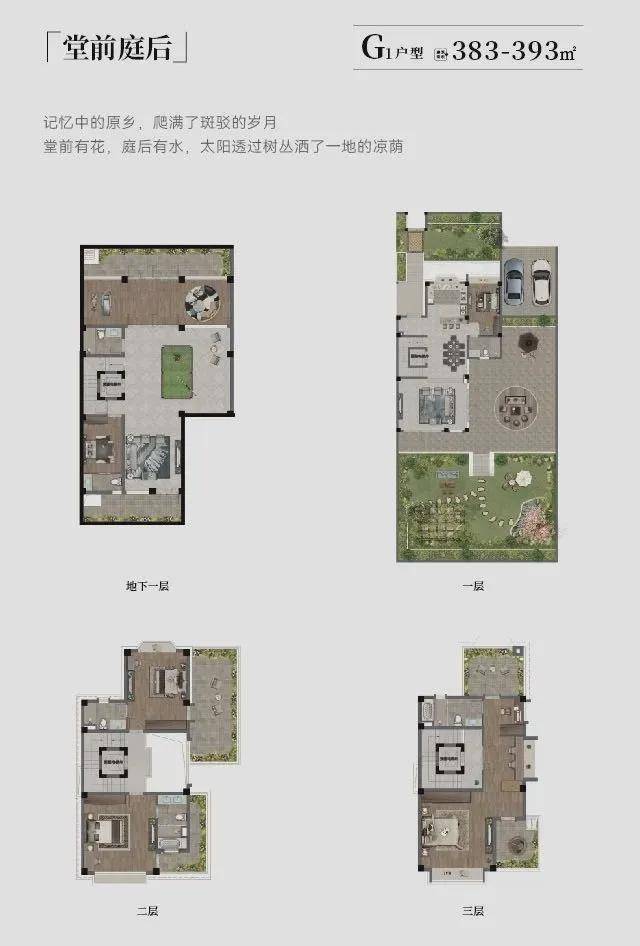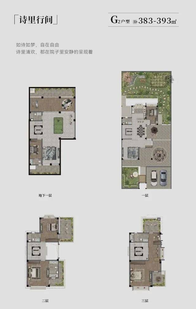 户型:独栋547-646㎡,双拼383-394㎡,地上三层+地下一层