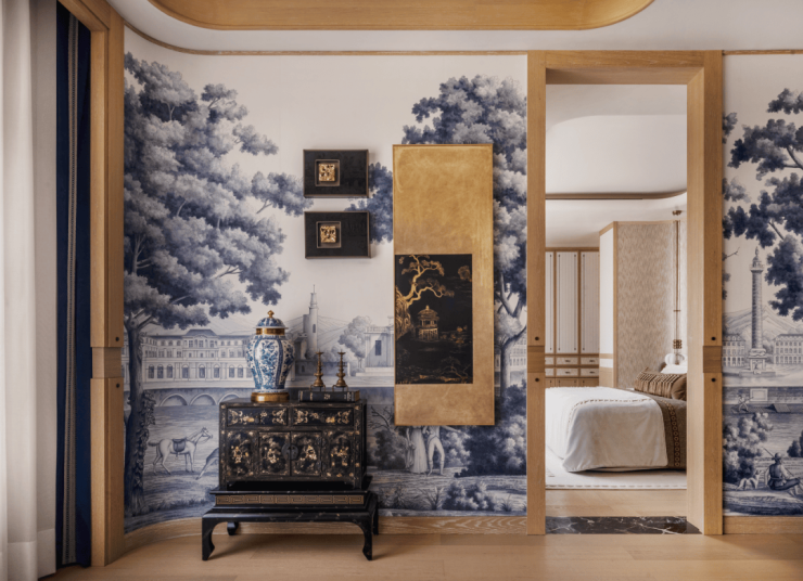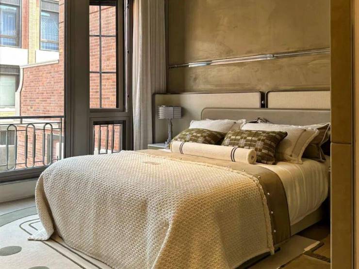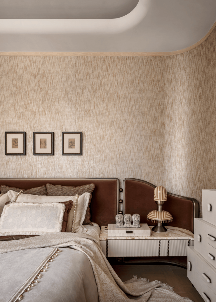 主卧室空间彻底告别了客厅厨房等公共空间的视觉感受,转而相背疾驰,虽然继续顺着同样的艺术风格,但却融入了更多适合睡眠和冥想的空间色彩陈设。