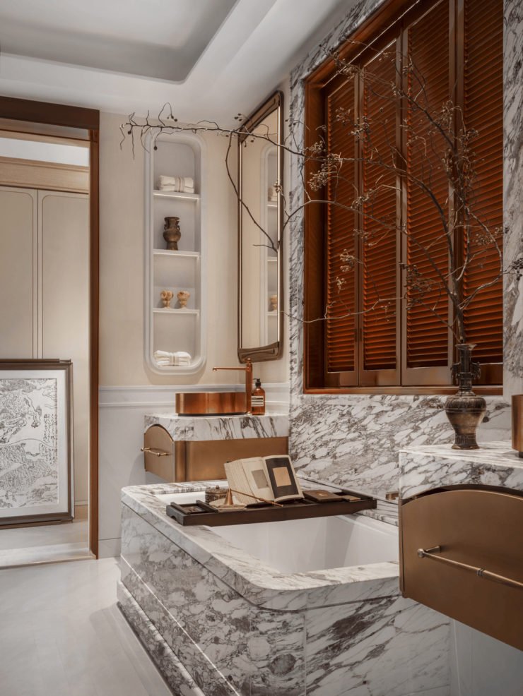 卫浴空间将静的元素浓缩到了极致,一如惺忪夜幕、一如皋皎明月。两者分别发挥法式和复古的独特亮点,以材质语言塑造带有神秘和优雅色彩的空间叙事。桐安里售楼处电话:400-9016-520⭐⭐