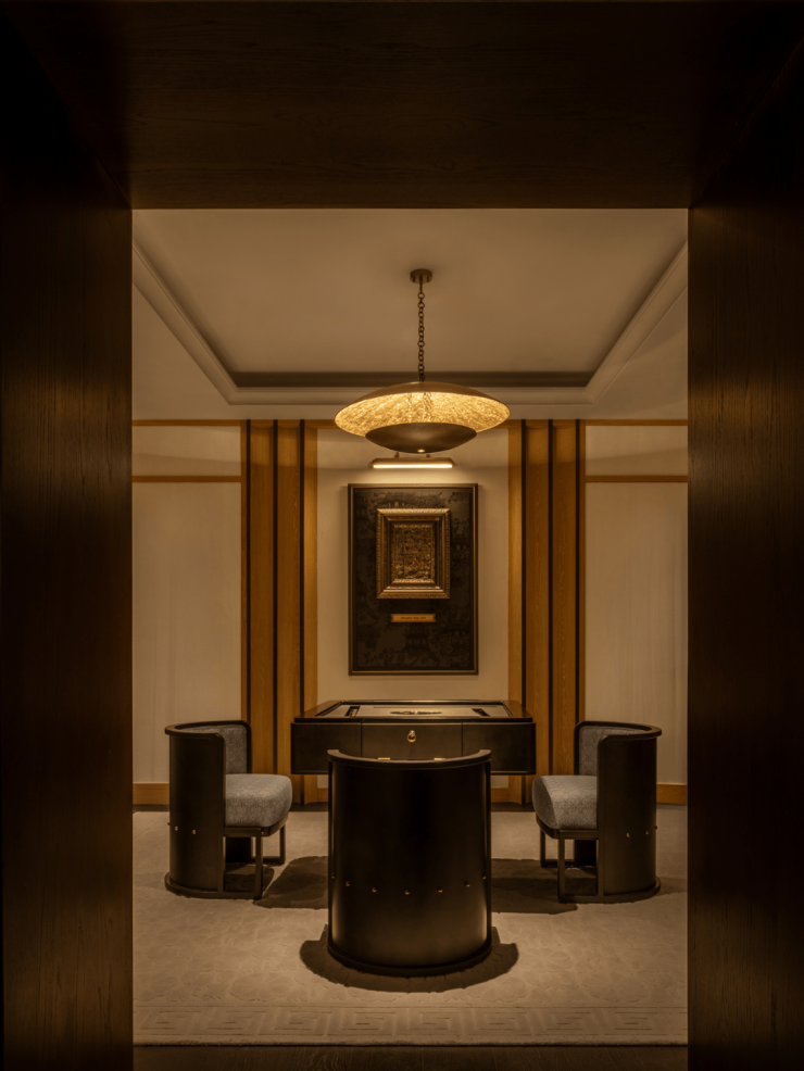 餐厅延续经典装饰艺术美学,以深绿色奢石餐桌、珠光椅面与手工金属吊灯营造低调而华丽的用餐氛围。从餐厅步入家庭室,将自然优雅与文化深沉融为一体,空间在静谧中流露复古气息。桐安里售楼处电话:400-9016-520⭐⭐