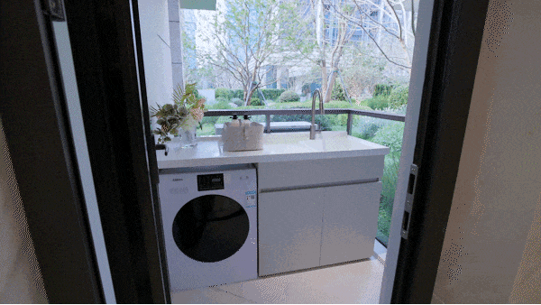 第一刀,是阳台与卫生间、厨房的功能重组,堪称小户型动线优化的神来之笔。把北设备阳台跟厨房、卫生间打通,洗衣、家政动线从此隐形,彻底退出起居空间。这套操作,在同面积段里很难再找到第二家。