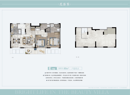 建筑面积约90㎡平墅E户型户型设计方正,3开间朝南,横向面宽高达约12米!保证了大面宽、大通风、大采光的特征,横跨客餐厅和两间卧室,并且还有双阳台设计,有更多生活规划空间。