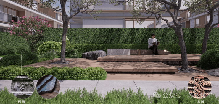 更令人心动的是,景墙端头的主题纹样暗藏玄机,回纹、万字纹、冰裂纹、云纹等经典符号被重新解构设计,在现代语境中焕新古韵;木坐凳的两端更缀以祥瑞图案,寓意吉祥如意,让江南匠人的千年技艺成为触手可得的日常场景。