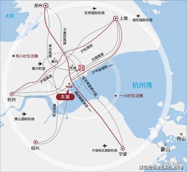 海盐的交通三维一体,距离项目2.5公里的为杭浦高速互通出口,沪杭高速、申嘉湖高速以及南面的杭州湾跨海高速,三条高速贯穿城市,与上海、杭州、苏州,宁波形成长三角一小时都市圈。